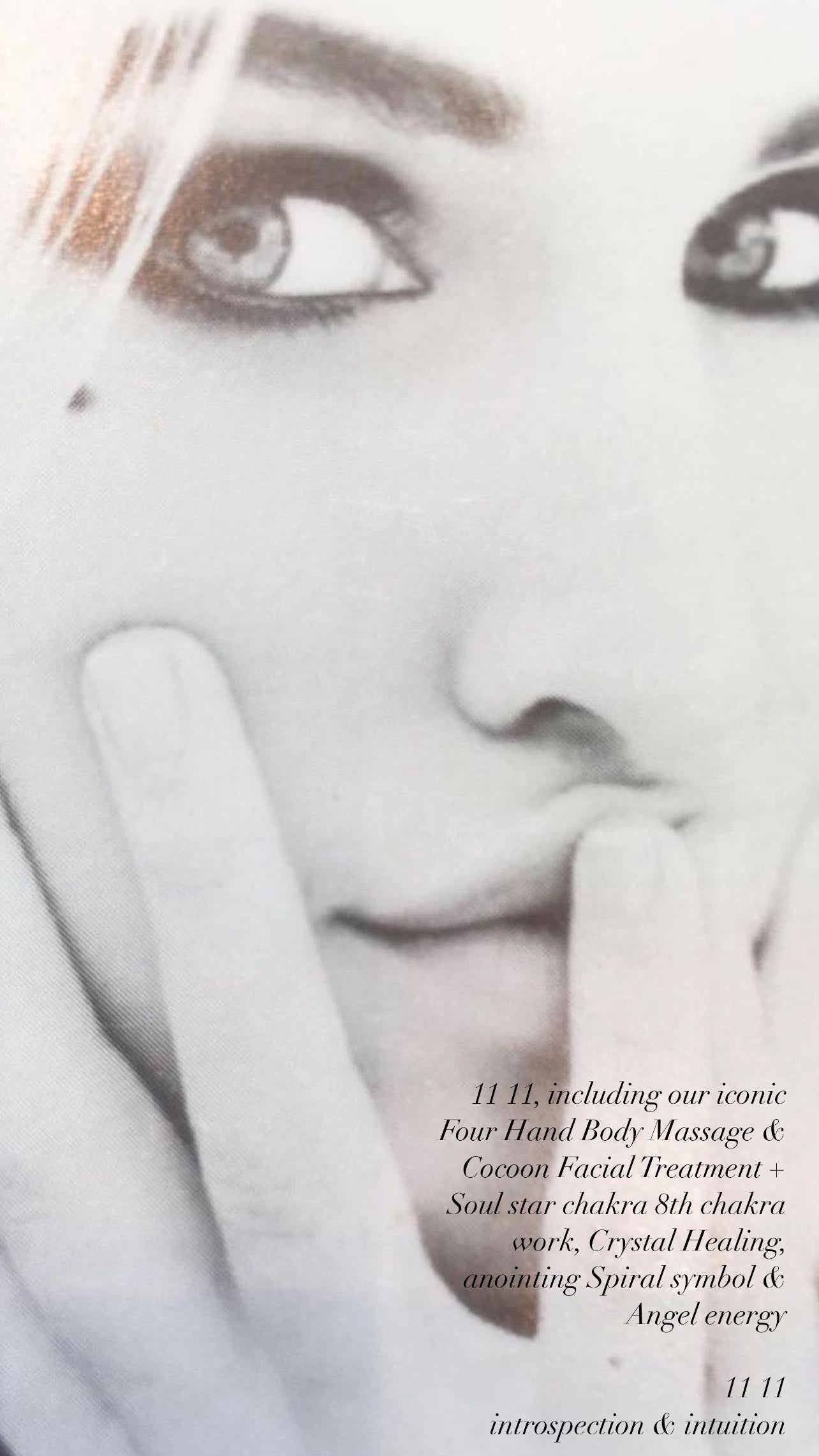 11 11, including our iconic Four Hand Body Massage & Cocoon Facial Treatment, adding Soul star chakra 8th chakra work, Crystal Healing, Anointing spiral symbol & Angel energy + small gift