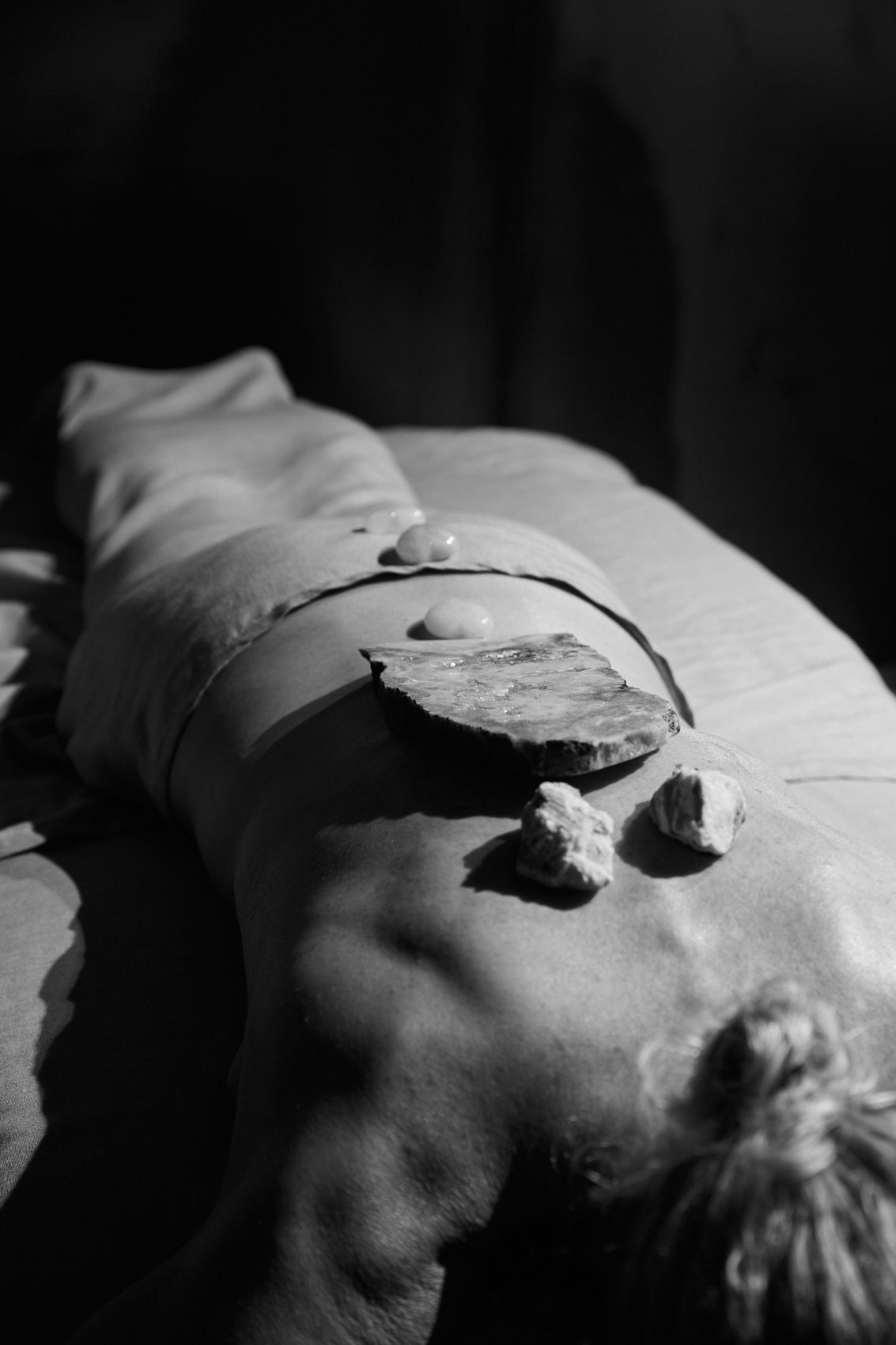 The body treatment begins with a scalp massage, inviting you to slow your internal rhythm for what’s to come. We move through four positions: lying on one side, hugging a body pillow, face down, onto your other side, and face up. This considered process slows down time during the massage, allowing us to attend to each muscle from the prime position.